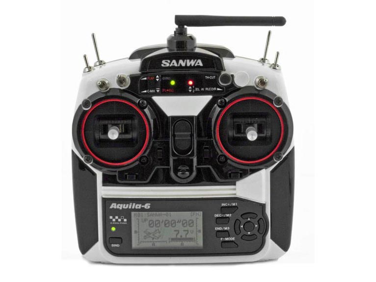 Nadajnik Aquila 6 firmy Sanwa stworzony został w oparciu na doskonałym radiu Sanwa SD-6G. Nowy nadajnik wyposażony został w jeszcze bardziej czytelny i intuicyjny schemat menu, dzięki czemu programowanie wszelkich parametrów i ustawień to czysta przyjemność. Odświeżona została również konstrukcja nadajnika - kompletnej zmianie uległ design korpusu, do którego budowy użyto najwyższej jakości materiałów, dzięki czemu radio prezentuje się znakomicie. Dodatkowo w celu ułatwienia obsługi podczas lotu modelem zmianie uległ również układ przycisków i przełączników. Radio zyskało także nowej generacji, małych rozmiarów 7-kanałowy odbiornik pracujący w modulacji 2,4 GHz FHSS-1, który znajduje się na wyposażeniu każdego zestawu z nadajnikiem.