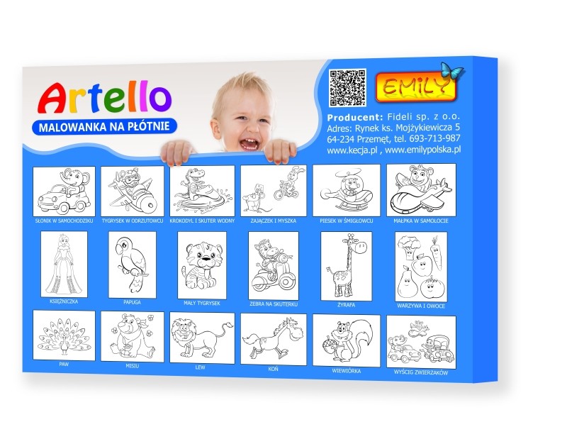 Malowanka na płótnie Artello została zaprojektowana z myślą o bezpieczeństwie najmłodszych. Płótna naciągnięte są na drewniane krosna (ramę), które są dokładnie oszlifowane. Do zestawu dołączone są zawieszki, a także drewniane klocki, które można wykorzystać, by lepiej naciągnąć płótno na ramę i wyrównać je.