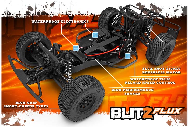 Blitz HPI jest teraz dostępny z super-szybki, bezszczotkowym silnikiem dla otrzymania ekstremalnych prędkości i mocy! Blitz łącząc najlepsze cechy: trwałość, funkcjonalność, wygląd, styl i innowacyjność i wszystko złozono w jeden gotowy do uruchomienia pakiet. Teraz ma więcej mocy niż kiedykolwiek! Z silnikiem Flux Shot 4300, kontrolowanego przez potężnego kontrolera Flux Reload V2 Flux Blitz jest gotowy na wszystko! Blitz RTR Flux jest wyposażony w wysokiej jakości system częstotliwości radiowej 2,4 GHz.