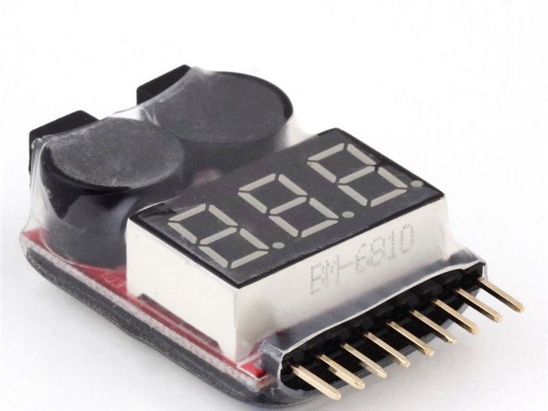 Bardzo głośny Buzzer-miernik napięcia od 1S - do 8S z alarmem przekroczenia minimalnego i maksymalnego napięcia na celi. Programowany przyciskiem.