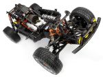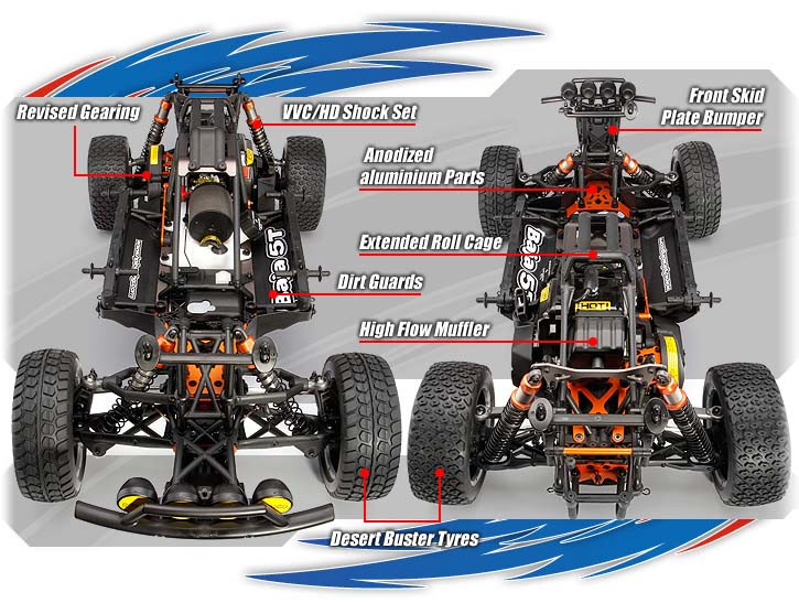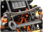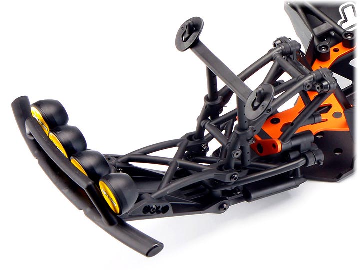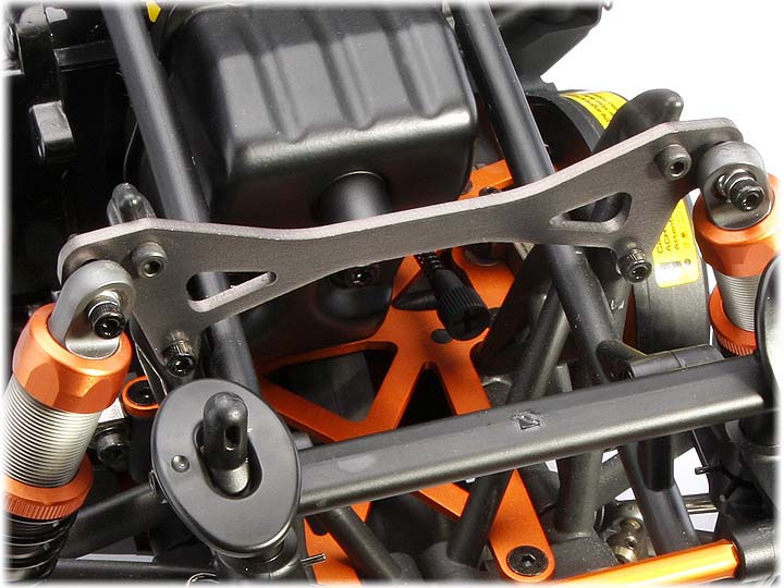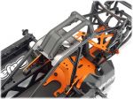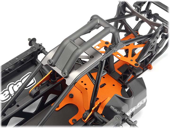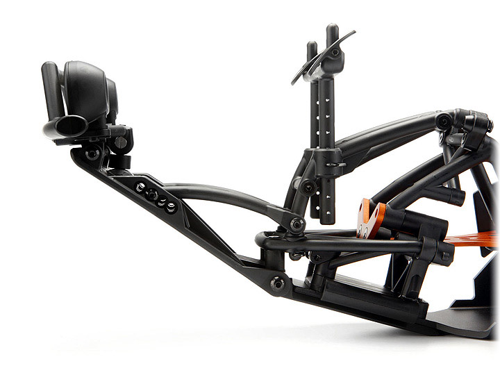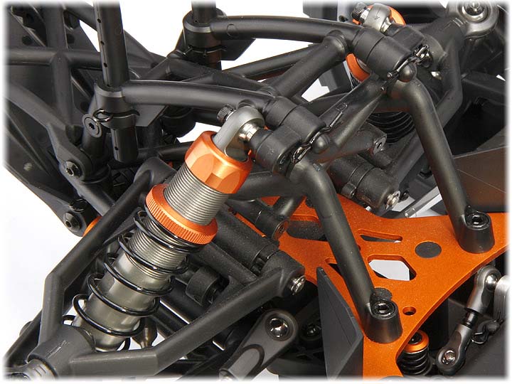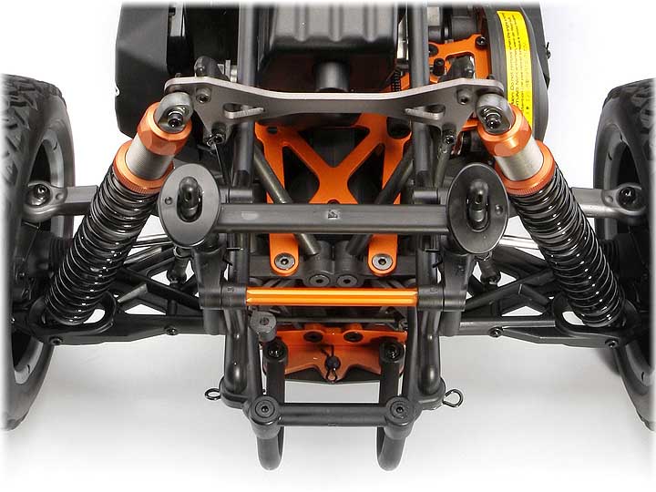 | Anodowane elementy aluminiowe – Czarne anodowane podwozie 6061-T6 o grubosci 4 milimetrów. Pomaranczowe lub niebieskoszare elementy anodowane nadaja modelowi agresywnego wygladu. | Podwójne wachacze – podwójne wachacze zamontowane z przodu doskonale tlumia nierównosci. | Regulowane zawieszenie – sruby rzymskie umozliwiaja szybka i latwa regulacje zbieznosci kól. Regulacja pochylenia kól oraz wyprzedzenia sworznia zwrotnicy umozliwiaja dopasowanie sterowania do róznych warunków. Wysokiej jakosci tworzywa uzyte w zawieszeniu chronia je przed zniszczeniem. | Lozysko kulkowe – 23 precyzyjnie wykonane lozyska kulkowe zastosowane w modelu zwiekszaja jego wydajnosc, precyzje oraz okresy pomiedzy serwisami. |