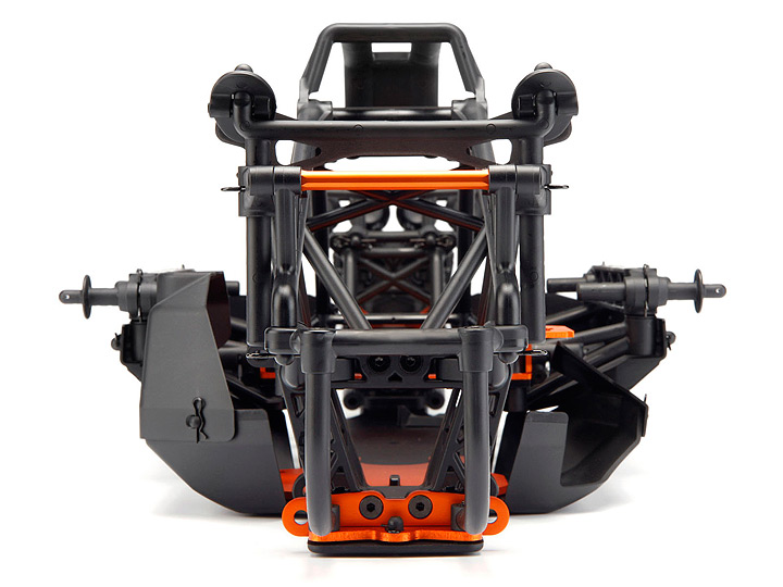 Nowy system montazu karoseriiZa prawidłowe i solidne osadzenie karoserii odpowiada zupełnie nowy system. 8 punktów montażowych pozwala równomiernie rozłożyć naprężenia działające na karoserie. Przedni zderzak, w którym osadzono 4 światła ochrania model przed niechcianymi skutkami długich skoków. Tylni spojler zapewnia stabilność modelu podczas jazdy w terenie. |