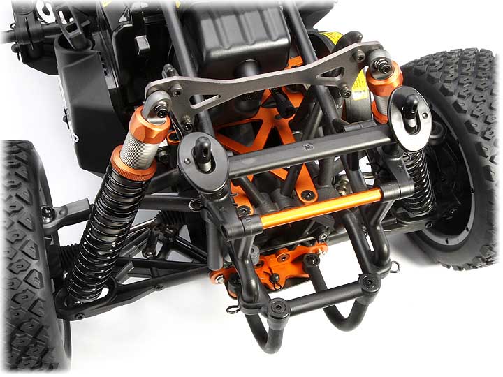 | Przednie i tylne drazki stabilizatora – zapewniaja precyzyjne i stabilne sterowanie. | Zmodyfikowane tylne zawieszenie – zapewnia stabilnosc na nierównych nawierzchniach oraz miekkie ladowania po wykonanych skokach. | Tylnie pólosie napedowe – metalowe konstrukcja zapewnia wyjatkowa trwalosc i swietna wspólprace z silnikiem Fuelie 26. | Disc Brake System – hamowanie jest kontrolowane przez wentylowane aluminiowo-stalowe tarcze oraz pólmetaliczne klocki hamulcowe. |