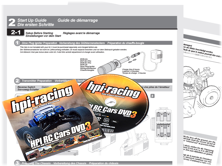 Instrukcja montazu oraz plyta DVD HPI RC CarsTak jak w przypadku kazdego modelu firmy HPI otrzymacie pelna instrukcje z opisem rozmontowania jak i ponownego zmontowania modelu abyscie sami mogli latwo go serwisowac i zmieniac jego ustawienia Informacje zawarte na plycie HPI RC Cars DVD powoli i szczególowo wprowadza was w swiat modeli RC. Plyta, która otrzymacie w zestawie bedzie waszym prywatnym ekspertem i przewodnikiem w swiecie modeli RC. |