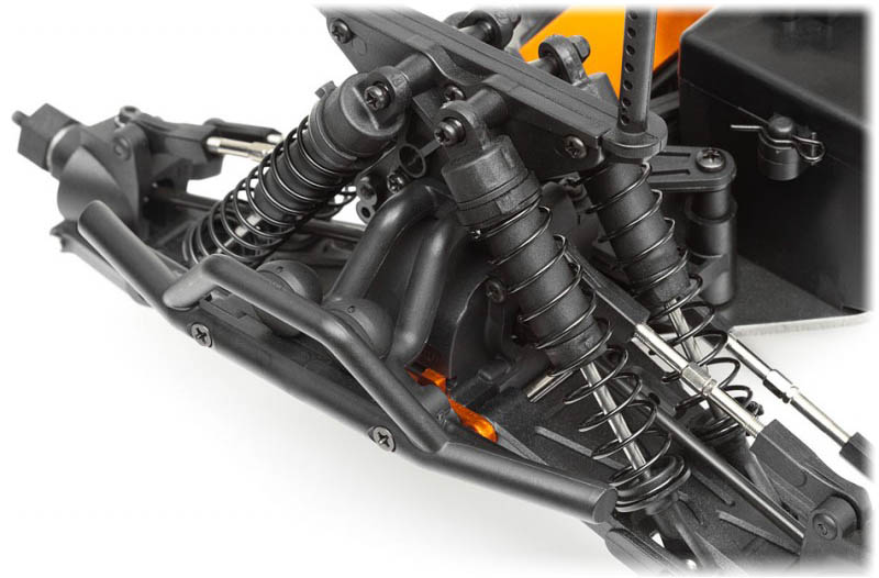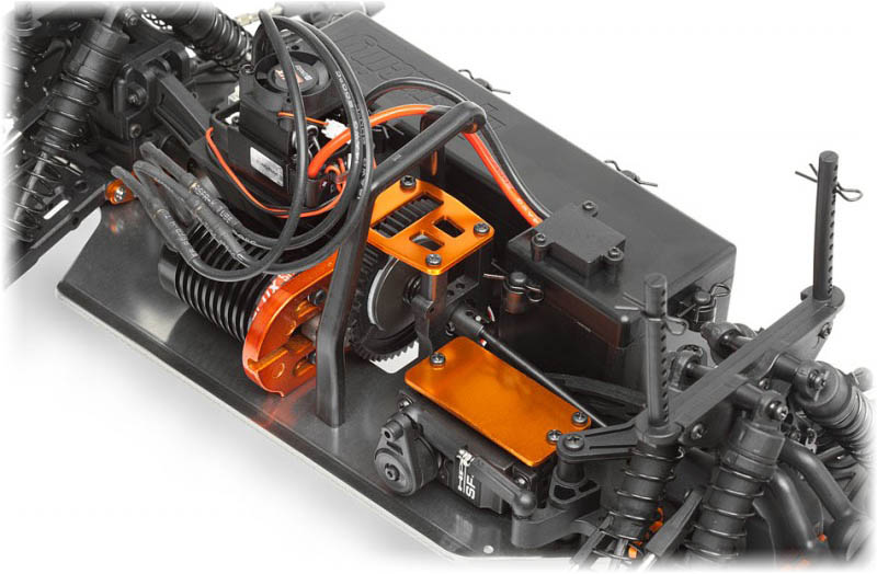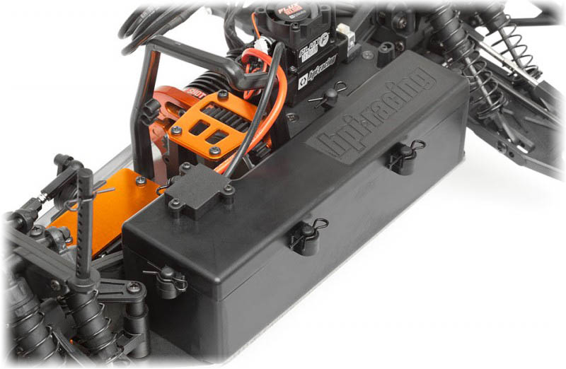 Wszystkie aktualne modele HPI są wyposażone w wygodne radio 2.4GHz zapewniające pełną kontrolę i umożliwiające korzystanie w pełni z walorów modelu. Radio posiada koło odpowiedzialne za skręcanie oraz spust, którym hamujemy i przyspieszamy modelem, 3 kanały, wygodna w użytkowaniu, składana antena, możliwość regulacji wyhyleń serw, prędkości maksymalnej oraz biegu wstecznego. Aparatura jest bardzo lekka, dzieki zasilaniu tylko 4 bateriami AA.