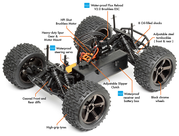 Nowy Bullet MT Flux wyposażony został w wodoodporną elektronikę, pojemnik na baterie i odbiornik, uszczelniony wodoodporny włącznik, wodoodporne serwo sterujące i w końcu wodoodporny kontroler który pozwoli ci jeździć twoim Bulletem w ekstremalnych warunkach które unieruchomiłyby inny pojazd!