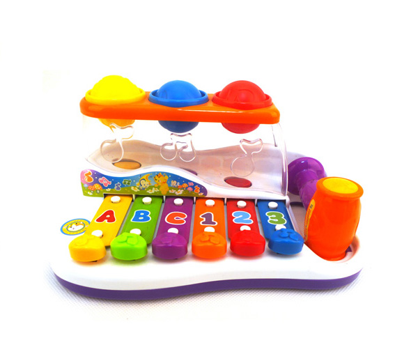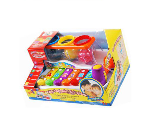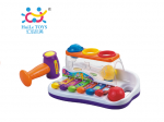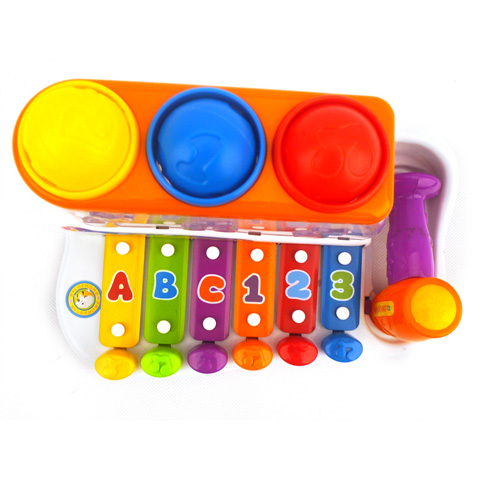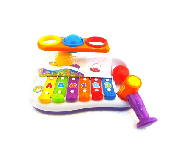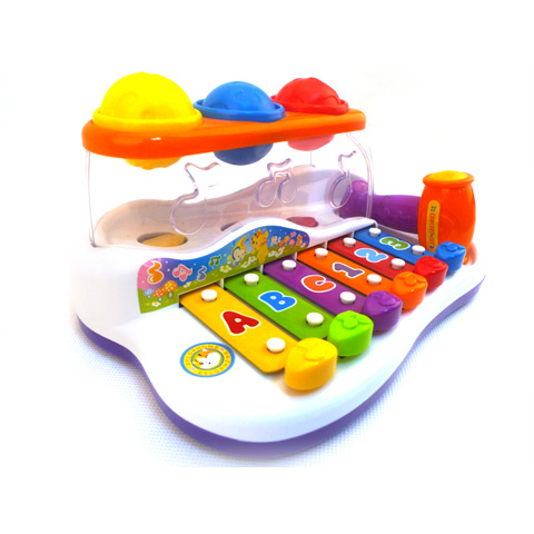 Wielofunkcyjna zabawka rozwijająca zdolności manualne, reguluje siłę i precyzję posługiwania się przedmiotami, uczy kolorów, kształtów. Cymbałki posiadają 6 przycisków w żywych kolorach, które dziecko naciska paluszkiem lub uderza młoteczkiem, dzięki czemu z instrumentu wydobywa się przyjemny dźwięk, pobudzając zmysł słuchu.