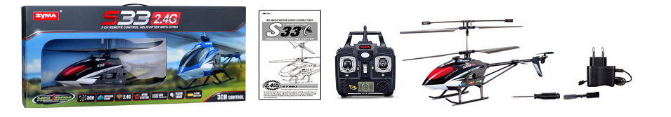 - Helikopter Syma S33 •Pilot zdalnego sterowania 2,4 GHz •Ładowarka sieciowa z balanserem •Śrubokręt •Zapasowe śmigło ogonowe •Instrukcja obsługi