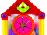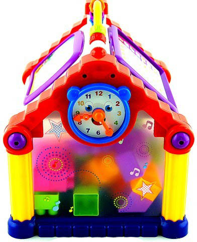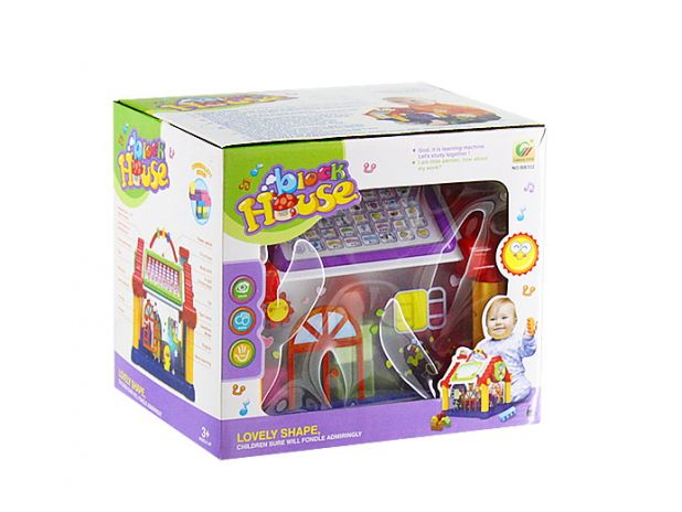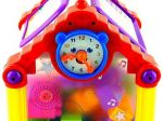 Z boku domku znajduje się otwór przez który dziecko może wyciągać i wkładać klocki z drugiej trony zegar ze wskazówkami.