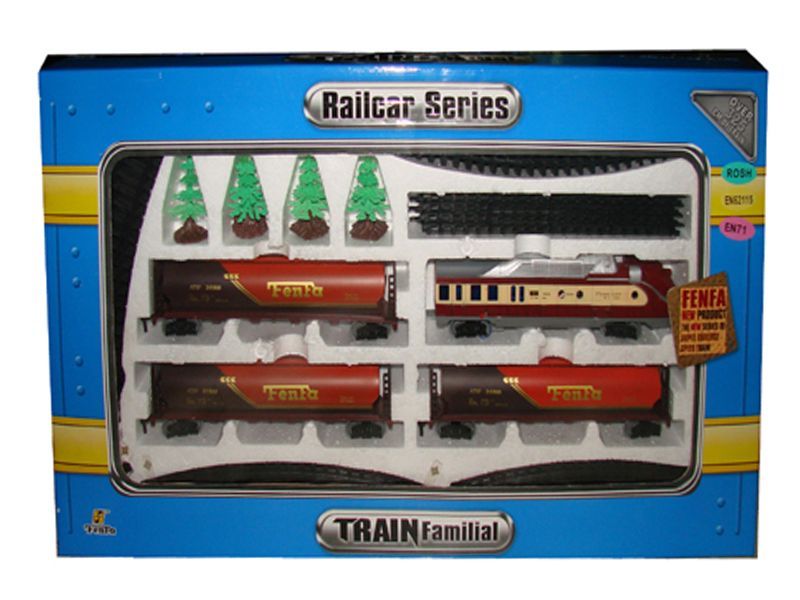 Netto: 65,00 PLNCały zestaw można układać w dowolnych konfiguracjach. Bardzo proste łączenie torów Lokomotywa zasilana jest na 2 baterie R6.