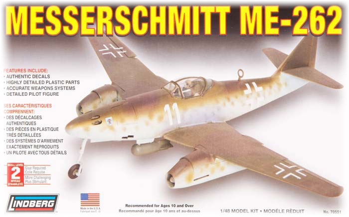 Netto: 54,96 PLNModel odrzutowca Messerschmitt ME-262 w skali 1:48, wyprodukowany przez amerykańską firmę Lindberg