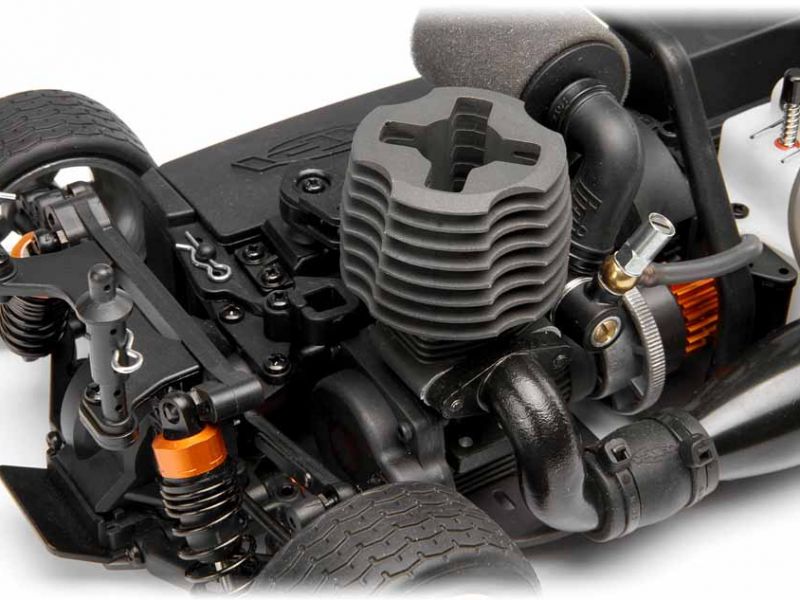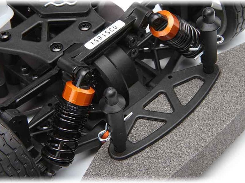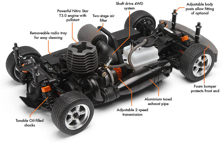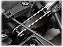 Niezależne zawieszenie z podwójnym łącznikiem poprzecznymTak jak w prawdziwym samochodzie wyścigowym, Nitro RS4 Evo jest wyposażony w dwa łączniki poprzeczne, duże niższe ramie A oraz górne linki pochylenia kół. Amortyzatory olejowe z wyścigowymi sprężynami progresywnymi kontrolują ruch ramion, i są łatwe do ustawienia - tak jak w prawdziwym samochodzie wyścigowym! | ![]() |