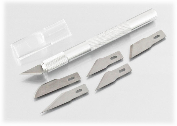 Nóż #2 w aluminiowej obudowie, w komplecie z plastikową nakładką zabezpieczającą ostrze i pięcioma różnymi ostrzami zapasowymi.