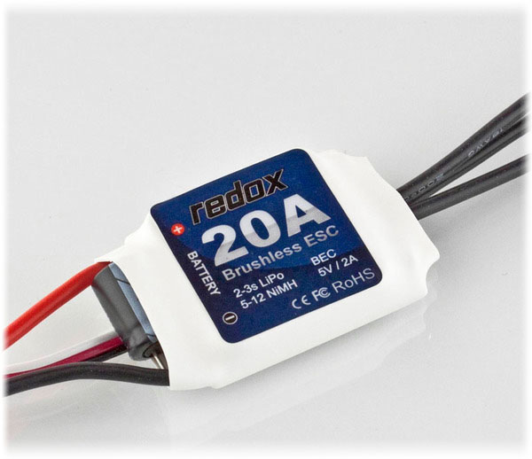 Regulator 20A do lotniczych silników bezszczotkowych wyprodukowany przez firmę Redox . Nowa wersja oprogramowania v2 .