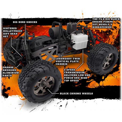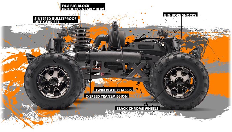 Masywny silnik F4.6 Big Block jest zaprojektowany w jednym ważnym celu - dostarczenia ogromnej ilości mocy! Prawie 3 KM to fakt z którym nie można dyskutować! Tak moc pozwoli Savage X 4.6 rozwinąć prędkość ponad 45 mil (73km/h)! Wysokoobrotowy silnik Big Block zapewni stabilną i szybką reakcję na każde dodanie gazu! Chcesz prędkości, wysokiego momentu obrotowego Savage X 4.6 ma to wszystko!