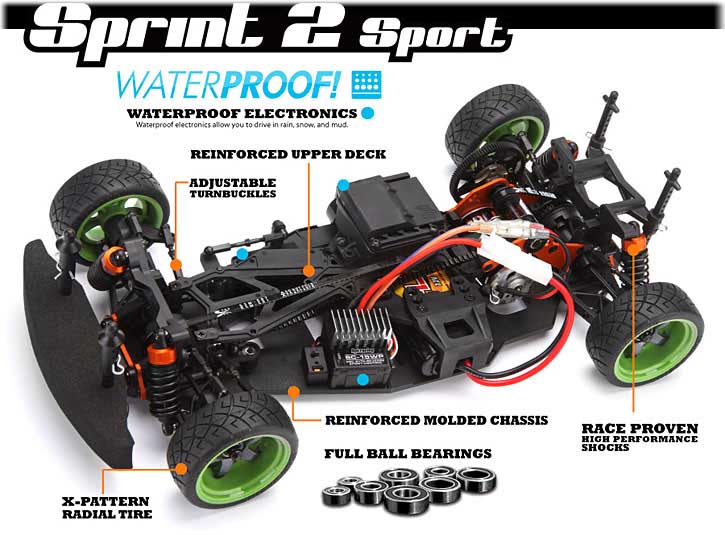 Wodoodporna elektronikaNowy RTR Sprint 2 Sport jest teraz wodoodporny i gotów radzić sobie w warunkach takich jak deszcz, śnieg i błoto. Nowy odbiornik 2,4GHz jest bezpieczny w wodoodpornej osłonie, zabezpieczony przed brudem gwarantuje bezproblemową eksploatację. Dopełnieniem tego pakietu ulepszeń jest nowe wodoodporne serwo SF-10W sterowania i nowy wodoodporny kontroler SC-15WP! | ![]() |