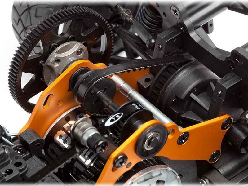 Napęd dwu-paskowyNapęd Sprint 2 opiera się ma podwójnych paskach napędowych oraz uszczelnionych łożysk kulkowych dla zapewnienia wytrzymałości i wydajności. Z centralnie zamontowanego silnika przez walcowe koło zębate, wał pośredni i centralne koło pasowe moc jest przekazywana do przedniego i tylniego mechanizmu różnicowego za pomocą wytrzymałych pasów napędowych zrobionych z uretanu dla zachowania wytrzymałości i odporności na ścieranie. | ![]() |