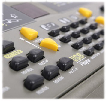 Duże kolorowe klawisze funkcyjne, przeróżne odgłosy perkusji.