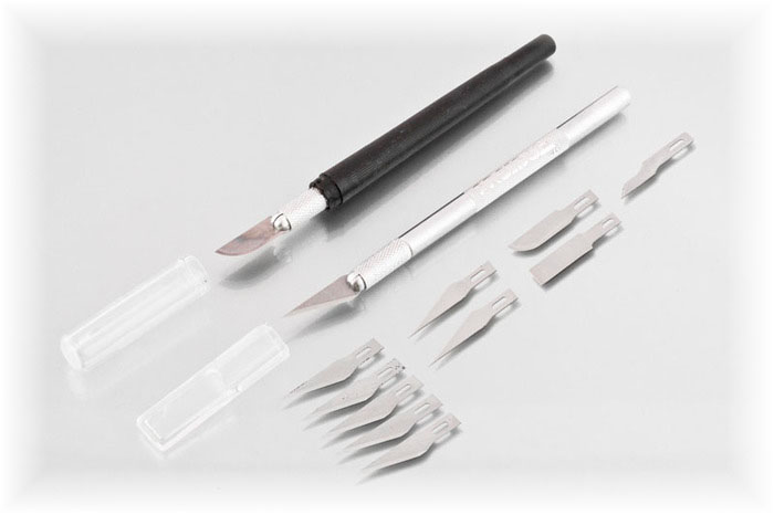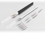 Zestaw składający się z 2 precyzyjnych noży oraz 10 różnych ostrzy zamiennych.