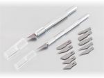 estaw składający się z 2 precyzyjnych noży oraz 10 różnych ostrzy zamiennych. Całość opakowana w plastikowym pojemniku w kształcie tuby.