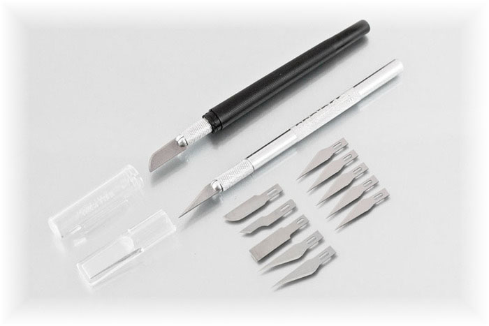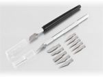 estaw składający się z 2 precyzyjnych noży oraz 10 różnych ostrzy zamiennych. Całość opakowana w plastikowym pojemniku w kształcie tuby.